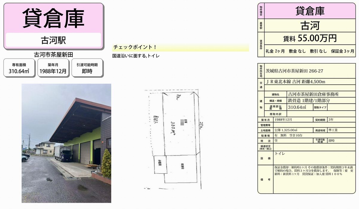 古河市茶屋新田266-27 (古河) 古河 貸倉庫 詳細データ