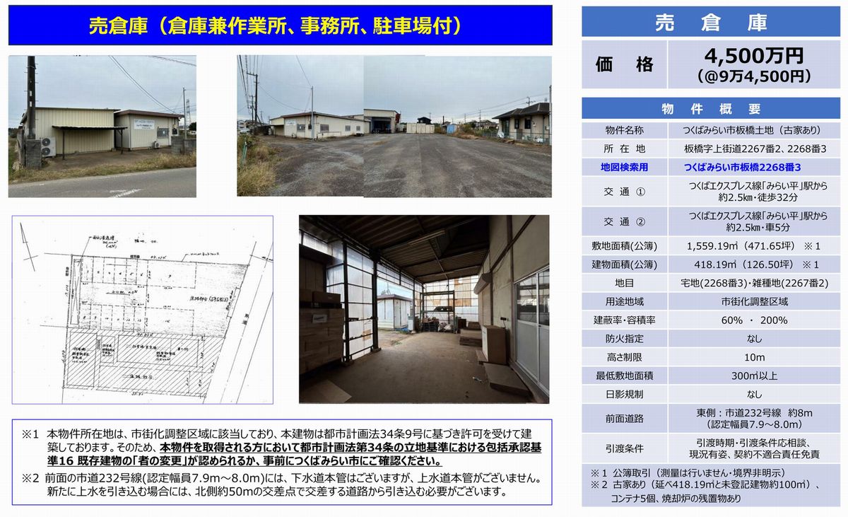 茨城県内の貸倉庫・貸工場・貸地の情報満載(トップ) > 茨城のエリアで探す > つくばみらい市 > みらい平 > つくばみらい市板橋2267-2 みらい平 売倉庫