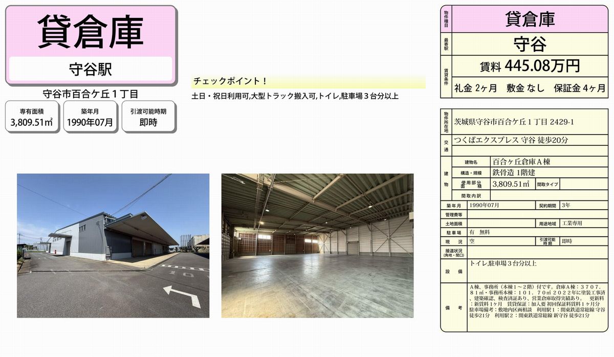 守谷市百合ケ丘1-2429-1 (守谷) 百合ヶ丘倉庫A 詳細データ
