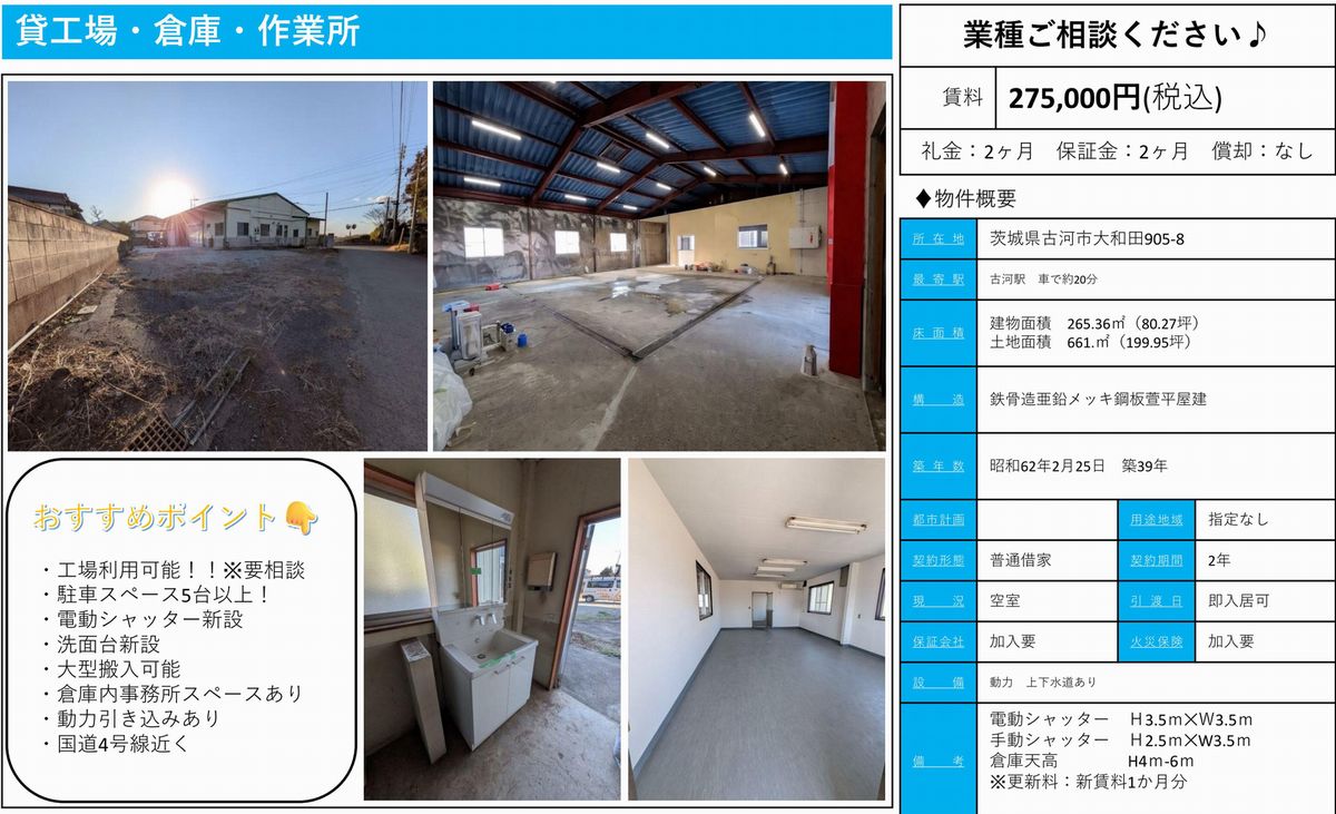 古河市大和田905-8(茨城県)の貸倉庫・貸工場・貸地をはじめ茨城全域の貸し倉庫・貸し工場・貸し土地を検索できます。古河市大和田905-8(茨城県)の事務所付貸倉庫、クレーン付工場、店舗倉庫、工業専用地域等、ニーズに合わせて簡単検索。古河市大和田905-8(茨城県)の貸し倉庫・貸し工場・貸地を貸したい方にはオーナーサポートシステムで無料にて査定・掲載いたします。古河市大和田905-8(茨城県)で貸倉庫・貸工場・貸し土地をご契約のテナント様には貸し倉庫・貸し工場の設計変更、造作のご相談・施工も承ります。貸倉庫・貸工場・貸地で移転・新規開設をするなら茨城地区最大級のテナント.com! |
