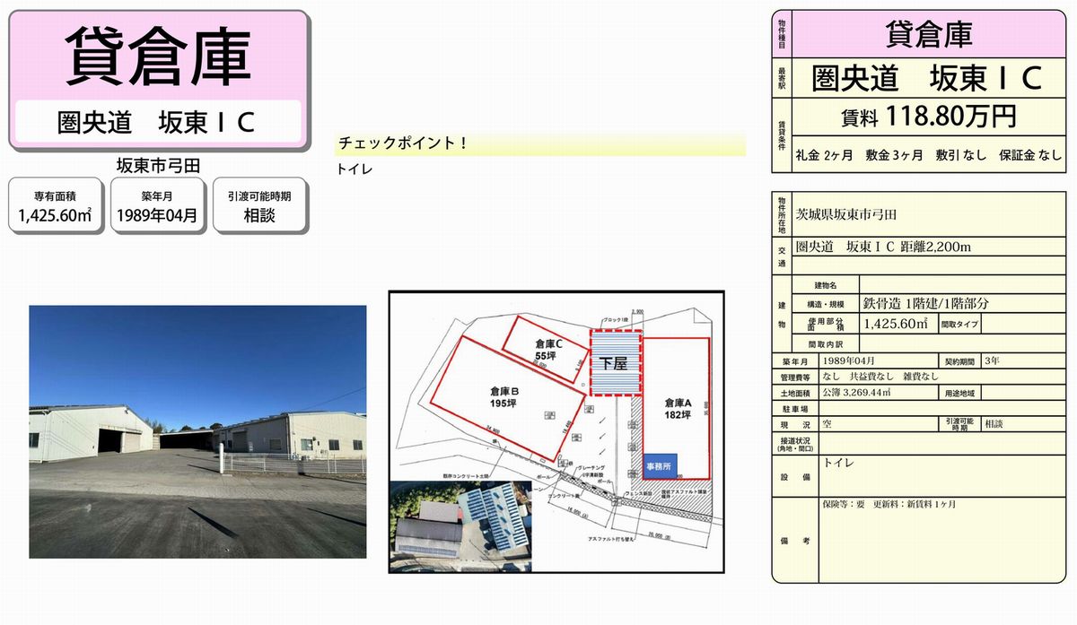 坂東市弓田2279(茨城県)の貸倉庫・貸工場・貸地をはじめ茨城全域の貸し倉庫・貸し工場・貸し土地を検索できます。坂東市弓田2279(茨城県)の事務所付貸倉庫、クレーン付工場、店舗倉庫、工業専用地域等、ニーズに合わせて簡単検索。坂東市弓田2279(茨城県)の貸し倉庫・貸し工場・貸地を貸したい方にはオーナーサポートシステムで無料にて査定・掲載いたします。坂東市弓田2279(茨城県)で貸倉庫・貸工場・貸し土地をご契約のテナント様には貸し倉庫・貸し工場の設計変更、造作のご相談・施工も承ります。貸倉庫・貸工場・貸地で移転・新規開設をするなら茨城地区最大級のテナント.com! |