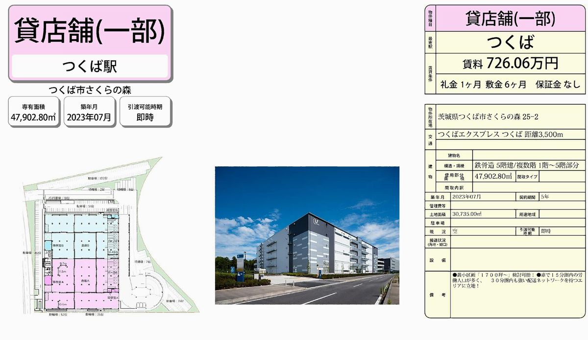 茨城県内の貸倉庫・貸工場・貸地の情報満載(トップ) > 茨城のエリアで探す > つくば市 > つくば > つくば市さくらの森 つくば 貸倉庫
