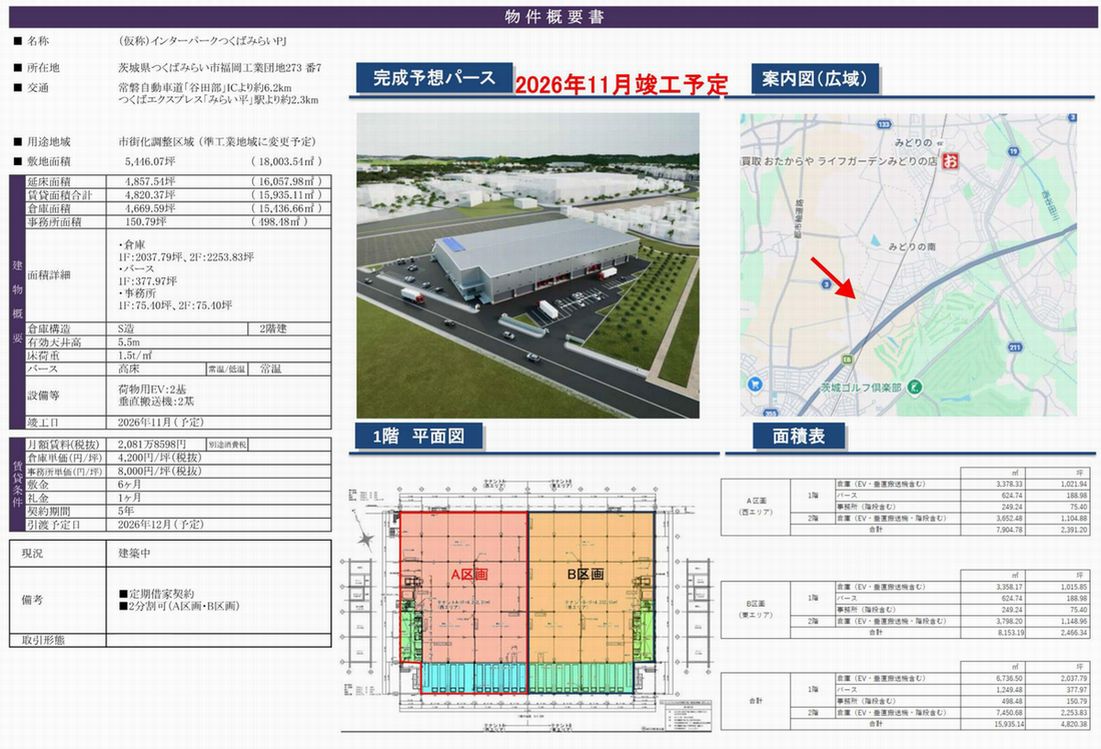 つくばみらい市福岡工業団地273-7 (みらい平) みらい平 貸倉庫 詳細データ